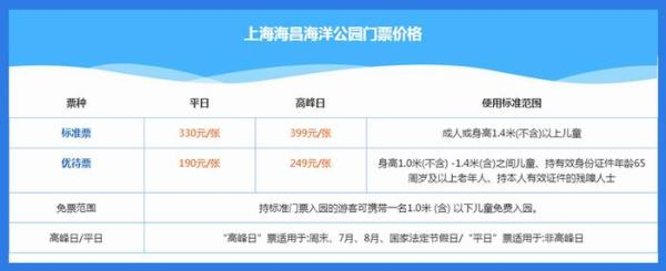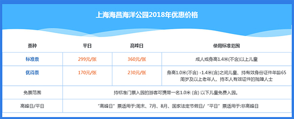 价格方面,平日标准门票价格为330元/张,平日优待门票价格为190元/张;高峰日标准门票价格为399元/张,高峰日优待门票价格为249元/张。上海海昌海洋公园2018年实施感恩优惠价格,平日标准门票价格为299元/张,平日优待门票价格为170元/张;高峰日标准门票价格为360元/张,高峰日优待门票价格为230元/张。