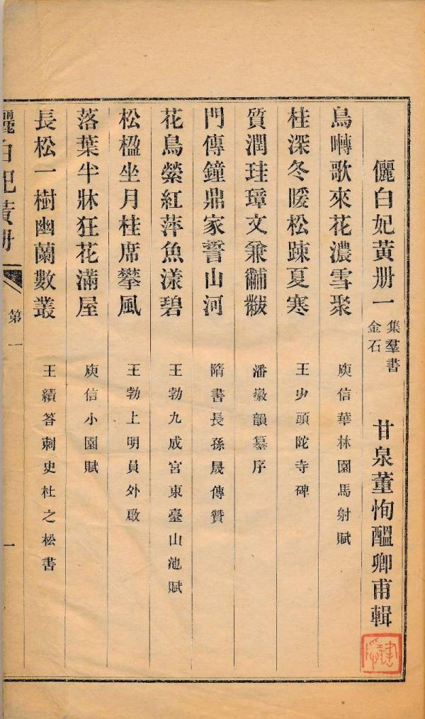 有趣的是,《俪白妃黄册》四卷排印完成后,董恂又续集了四卷楹联,但他没有继续在同文馆用铅字排印,而是在十一月付诸雕版。刻本《俪白妃黄册》封面后有牌记说:“八册统成于同治十有二年。前四册先于秋八月以集珍铅字刷印,旋付剞劂,于仲冬月与后四册一并开雕,次年三月既望讫工。”这部书的两个版本有力地说明,至少对同文馆的领导者董恂来说,铅字印刷尚未被认可,他心目中的最佳印刷方式仍是雕版。