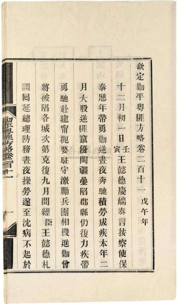 两书排印用时两年有余,至光绪二年(1876)二月告竣,首先颁赐王大臣及各部尚书、侍郎。现在的书目均将两《方略》的印行时间定为同治十一年,可那时同文馆印刷所尚未建立,这是以序定年造成的错误,应更正为“同治十二年至光绪二年铅印本”。