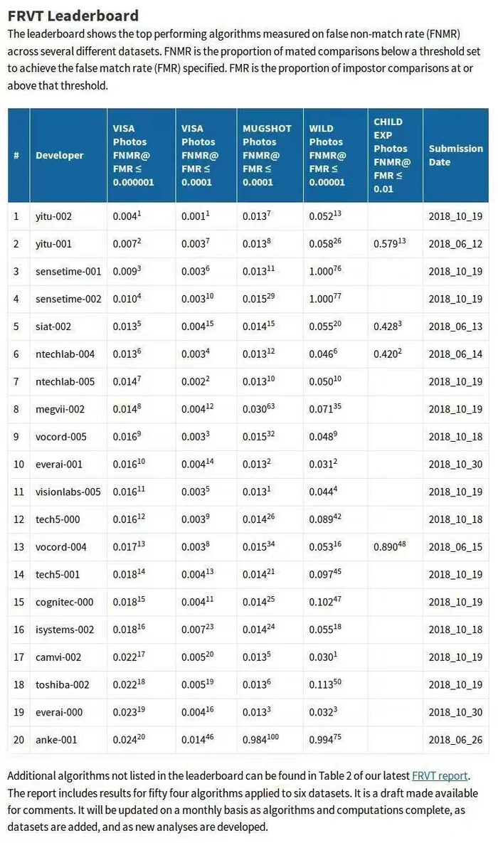 2018年11月16日公布的FRVT最新报告。排名第一的是依图科技于2018年10月提交的算法,排名第二的是依图科技于2018年6月提交的算法。来自商汤科技(sensetime)的算法位列第三和第四名。