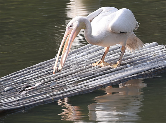 目前这两只白鹈鹕还有点认生,毕竟刚来到红山动物园不足一星期。就连饲养员喂食,它们都会躲得远远的,等饲养员把小鱼放在它们栖息的竹筏上走开以后,它们才会上竹筏来吃鱼。游人多的时候,两只大鸟就在湖中心戏水;等到游人少了,它们也会上岸来,在岸边散步,顺便卖卖萌,十分可爱。