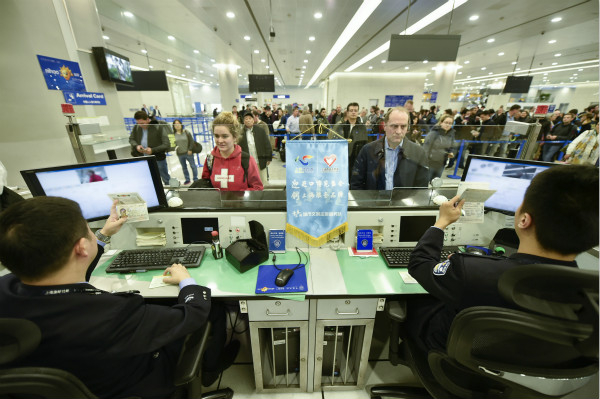 图说:进博会期间边检民警正在口岸现场查验出入境旅客。上海边检总站供图