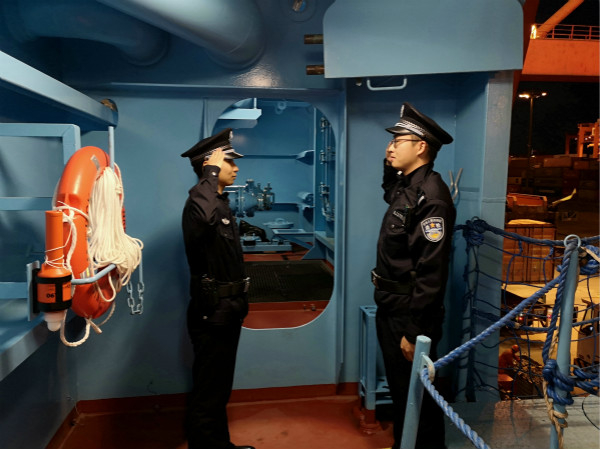 图说:边检民警凌晨时分在外轮梯口交接班。上海边检总站供图