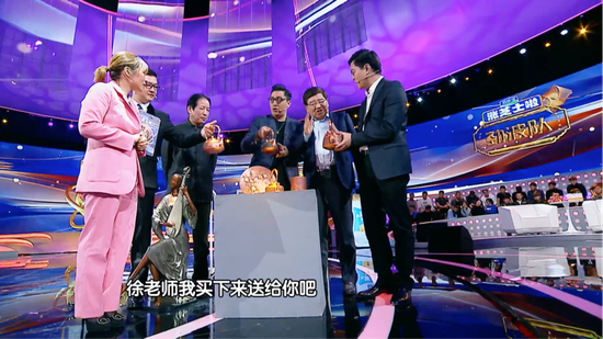 作为队长,“萌叔”姚劲波在为队员自豪的同时,再次为大家展示了他的“火眼金睛”,在诸多展品之中瞬间识别出价格最低的,并果断下单赠与“判官”徐小平,引发爆笑。