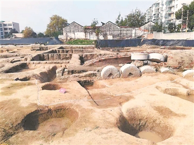 “先秦时期,西街地块西临大江,北滨淮水,与文献记载的越城位置和形势吻合。早年的考古调查、研究成果已推测西街项目地块内中部区域(原油脂厂)是古越城遗址所在。”陈大海透露,此次发现的西周时期壕沟与越城遗址年代相近,里面发现的陶片经过碳十四检测,其年代也和越城吻合,但能够直接确认越城遗址的文物暂时还没有发现,西街遗址考古还在继续,不排除有新发现的可能。