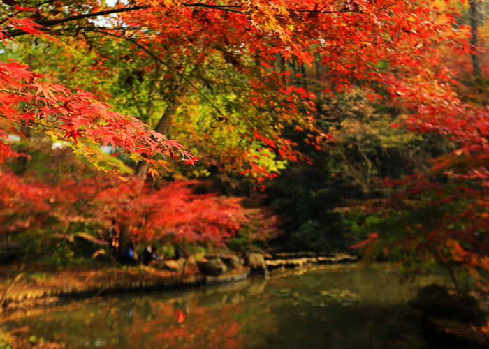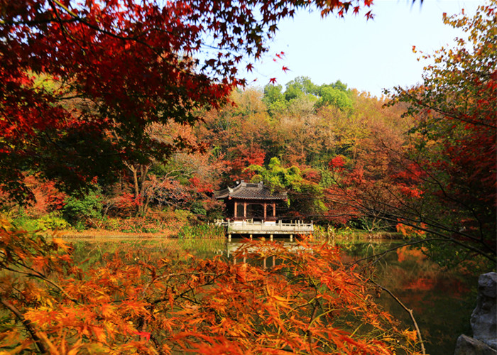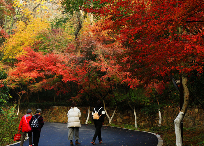 从景点上看,栖霞山今年最美赏枫点应是陆羽茶庄、虎山读枫阁。栖霞山今春重点对明镜湖至陆羽茶庄、南门至饮马池的道路两侧进行了色叶树种的补种栽植,共计新增色叶树种五千余棵,红叶整体景观和色彩更佳,目前,陆羽茶庄至小营盘栈道沿线已经卓见成效。到虎山读枫阁,游客可登高远眺,眼前顿时映入层林尽染的红叶画卷,秋天的栖霞山正在展现大自然的独特魅力。