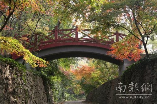 植物园红枫岗位于北园核心景区内,总面积约5000平方米,由一字排开的四个小岗组成,地势绵延起伏,景色清幽秀丽,主要有红枫、鸡爪槭、建始槭等,并搭配有枫香、榉树、榆树、黄连木、盐肤木等彩叶树种10余种,逾5000株,是南京地区红叶种类较为丰富、景观颇具特色的赏红叶景点。 来源:南报网