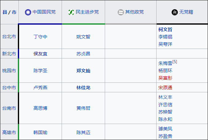 目前,台湾各地县市长候选人主要如下(字体加粗的为竞选连任者):