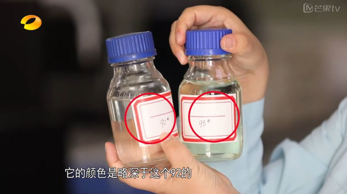 两个男子从德国产汽车中抽出原装汽油,然后和我国国内汽油对比。对比发现,德国汽油是无色的,而国内汽油是淡黄色,因此得出结论:无色的汽油品质更好。