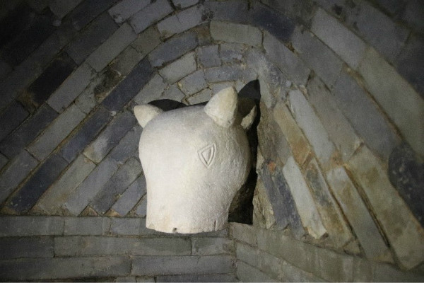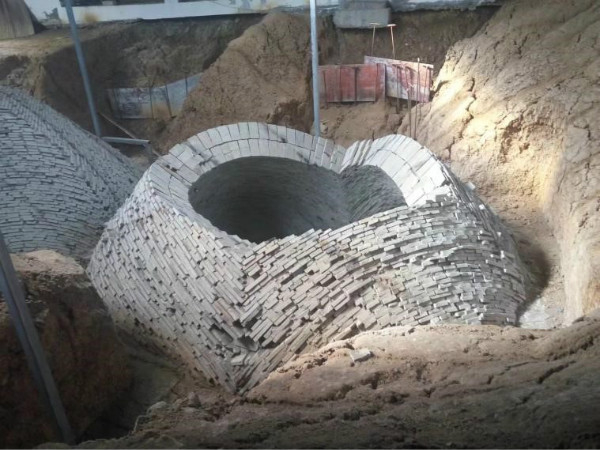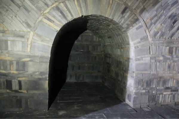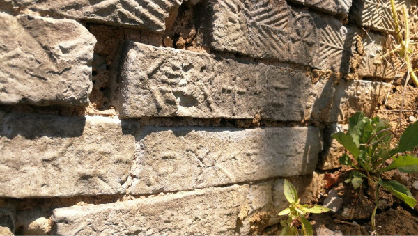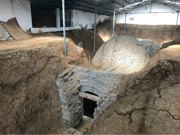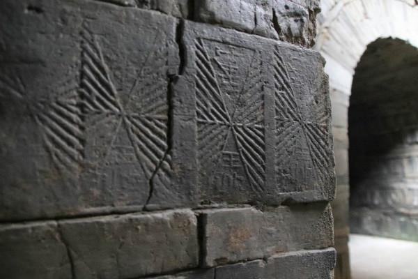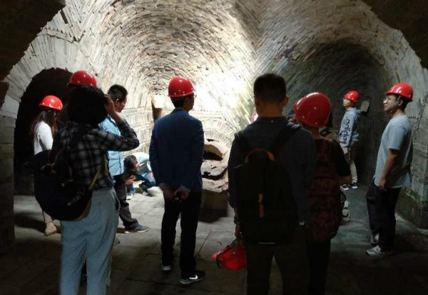 我们在墓室中驻足良久,许多同学出于初次下墓的新奇,在墓室中来回走动,打着手电对每一方青砖、每一处墙隅都细细思索、慢慢回味。室外的阳光经由头顶的盗洞将整个陵墓后室照得通透明亮,其建筑形制和造型风格一览无遗。墓室中的拱券和穹顶都是单纯地用砖块累砌起来的,没有使用任何黏合剂,靠的就是这种结构下块料之间产生的侧压力,有很好的承重效果。我们发现墓室的青砖存在着长方形、方形、楔形、刀形等各种不同形制,分用在墓底、墓壁、墓顶等各处,以三顺一丁、二顺一丁、“人”字形或平砌等方法砌筑,不少砖面上还模印着花纹。