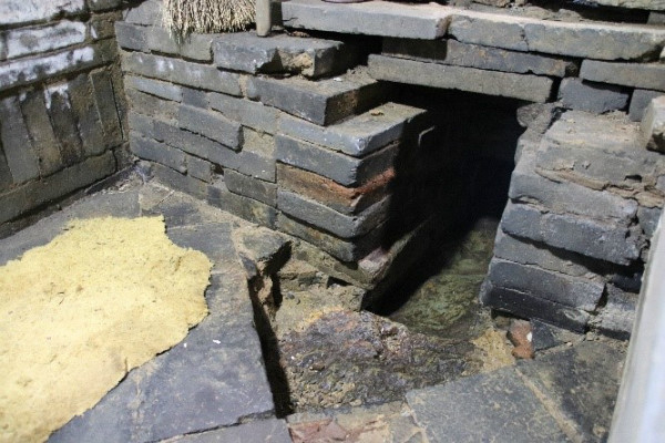 走出墓室时,我们在甬道口发现了大墓排水沟。排水口偏于墓道东侧,就在甬道口的铺地砖下,穿过了石门和封门墙。《发掘简报》上说,它将沿着斜坡墓道一路向南延伸,一直通到墓前的一条古河道中,全长有326米。而且越往前越深,充分利用地势的落差来排水。墓前的27米为明沟,再向南则为明沟与暗沟相间铺设。可惜发掘之后就已经回填,棚屋外荒烟漫草,再不可见。