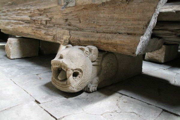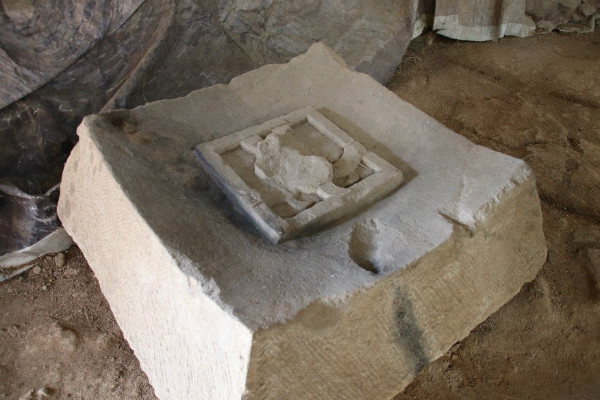 进入棚屋,便可一窥墓葬全貌。根据王志高先生等所撰写的《南京上坊孙吴墓发掘简报》(《文物》杂志2008年12月刊,总第六三一期,第4-34页),此墓为土坑竖穴砖室墓,长20.16米,宽10.71米,由封门墙、石门、甬道、前室、过道、后室组成,前后室的两侧对称有耳室,后室的后壁底部还有两个壁龛。门左手边放置着一块方形的石顶盖,呈覆斗状,四角各雕有一吊环,中央方框内雕有神兽。工作人员告诉我们,2005年12月22日,江宁科学园道路建设施工队的机车,一铲挖到了前墓室的覆顶石,从而使孙吴大墓得见于世。但可惜的是,覆顶石顶部所立的神兽亦被毁,其前须、爪、尾尚留有残余刻纹,只此便可见其筑造之精美。