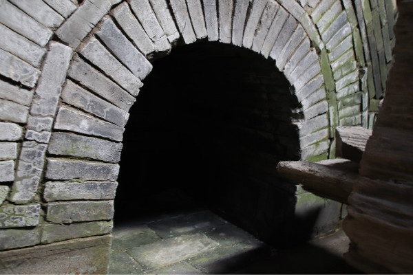 前、后室之间的过道亦为券顶,长约2米。大家走过墓室过道时,童岭老师提醒大家蹲下看过道墓壁的长条青砖上印有放射线形的浮雕花纹,似乎依稀可辨“王化”二字。