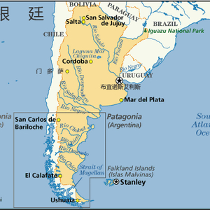 [简况] 位于南美洲东南部,东濒大西洋,南与南极洲隔海相望,西邻智利,北与玻利维亚、巴拉圭交界,东北与乌拉圭、巴西接壤。南北长3694公里,东西宽1423公里。陆上边界线长25728公里,海岸线长4725公里。北部属热带气候,中部属亚热带气候,南部为温带气候。年平均气温北部24℃,南部5.5℃。