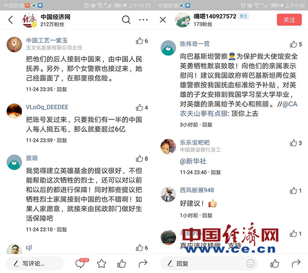 据《经济日报》的报道,事件发生后,中国驻巴基斯坦当地华人迅速发起了为遇难的两位警员家属的募捐。据介绍,牺牲警员中一位有两个孩子,家里需要照顾,另一位警察已经是家中第三个殉职的警察,他有四个孩子。