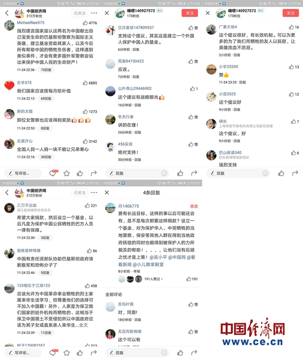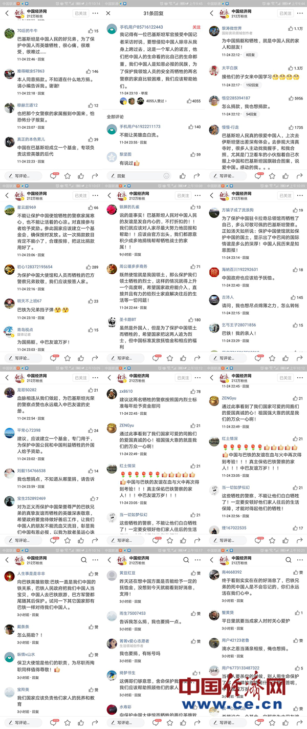 巴基斯坦《黎明报》24日报道称,虽然巴基斯坦警察为了守卫卡拉奇领事馆的中国工作人员而牺牲了生命,但中国人民并没有忘记巴基斯坦朋友的牺牲和损失,在当地华人社区和中国国内,发起了为两位牺牲警员家属募捐的倡议,报道还转发了中国社交媒体活动的截图。