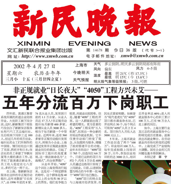 刊登在2002年4月27日新民晚报头版头条的这篇报道,讲述的就是这段不寻常历程。报道中写道:“‘4050’这个群体是指40岁以上的女性和50岁以上的男性,他们竞争能力较差,再就业比较困难。但是,随着‘4050’工程的开展,这一人群面前出现了希望的曙光。”