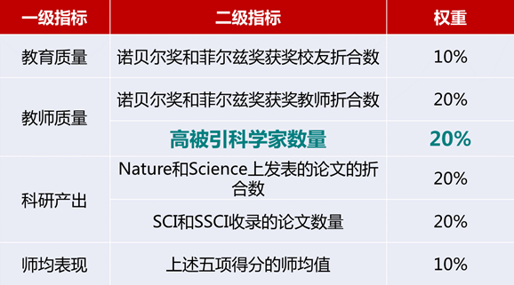 高被引科学家数量是世界大学学术排名(Academic Ranking Of World Universities)重要的衡量指标之一,所占权重达20%。