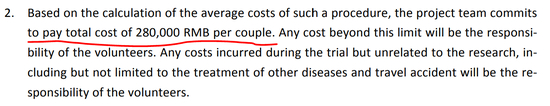 在第七章“谁将承担该研究的参与费用”中,明确写到“该临床试验费用由南科大贺建奎实验室获得的项目经费进行支付”,包括住宿费、参与项目期间的失业津贴、怀孕检测费用、新生儿的保险费等等。以分列的费用标准计算,项目组将付给每对志愿者夫妇28万元人民币。