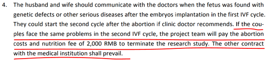 第六章“参与和完成项目是否有必要”中,第四条提到,在第一个体外受精周期中胚胎植入后,当发现胎儿存在遗传性缺陷或其他严重疾病,应当与医生沟通。如果医生推荐的话,可以在流产后开始第二个周期。如果夫妇在第二个周期遇到了同样的问题,项目组将支付堕胎费用以及2000元营养费,以终止该研究。其他条款以和医疗机构签订的合同为准。