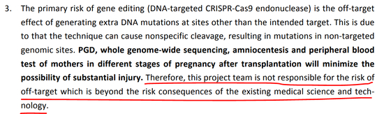 在第三条中,提到实验会有脱靶等风险,也提到了有不同检测手段可以最大程度地减少造成重大伤害的可能。但项目组不承担脱靶带来的风险,因为这“超出了现有医学科学和技术的风险后果”。