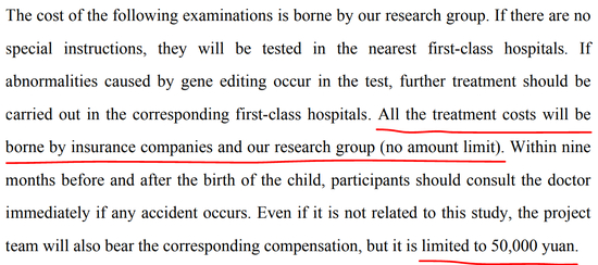 另一份对知情同意书补充解释,则是针对在该研究项目下出生的孩子。在尊重其个体自主权的前提下,制定了长达18年的健康跟踪计划,其中一段提到:如果是因为测试中的基因编辑引起了异常,所有诊疗费用将由保险公司和项目组承担,并且无赔付上限。如果在婴儿出生前后的九个月里有任何情况发生,应第一时间咨询医生。即便问题与本研究无关,项目组也将支付最高不超过5万元的相应赔偿。