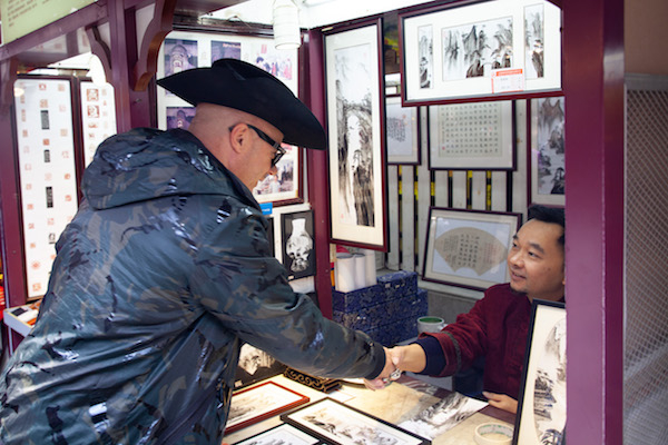 澎湃新闻:豫园之行中,你有发现什么吗?我注意到你两次停留在一个“指掌书画”的摊位前,你对“指掌书画”似乎很感兴趣,可以和我们分享一下你的发现吗?