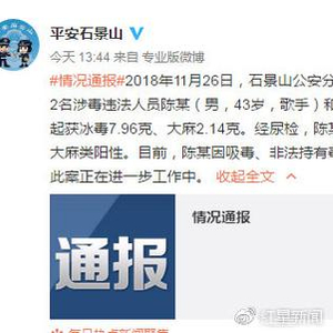 据北京市石景山公安分局发布的警情通报,2018年11月26日,根据群众举报,在市内某小区抓获2名涉毒违法人员陈某(男,43岁,歌手)和何某某(女,25岁,无业),现场起获冰毒7.96克、大麻2.14克。经尿检,陈某呈冰毒类和大麻类阳性,何某某呈大麻类阳性。目前,陈某因吸毒、非法持有毒品,何某某因吸毒均被行政拘留。