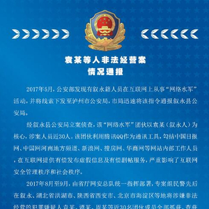 通报称,2017年8月至9月,由四川省公安厅网安总队统一指挥部署,专案组民警先后在叙永县、湖北省洪湖市、陕西省西安市、北京市海淀区等地将涉嫌非法经营的犯罪嫌疑人袁某、谭某、周某等近30名团伙成员全部抓获。查获作案工具手机40部、电脑30余台、U盘7只,案件涉案金额达2000余万元。该团伙的覆灭是四川全省公安机关破获的首例“网络水军”团伙案。