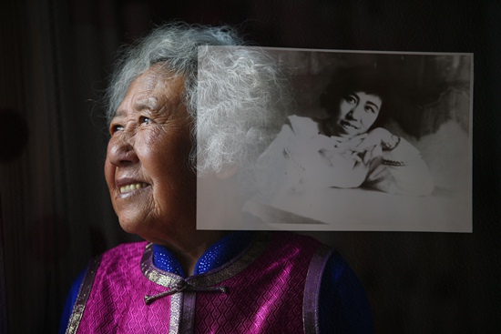 内蒙古自治区苏尼特右旗,第一代乌兰牧骑队员、第二任队长、83岁的伊兰在县城家中,右边是她年轻时的照片。她在加入乌兰牧骑前是一名机关干部。(照片为二次曝光)