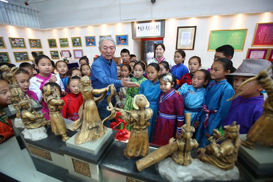 内蒙古自治区苏尼特右旗乌兰牧骑第五任队长巴图朝鲁在纪念馆给孩子讲解当年演出、服务牧民的历史。