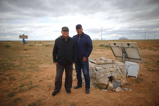 内蒙古自治区苏尼特右旗,哈达巴特尔、额日和木兄弟俩在“乌兰牧骑井”边。当年,他们的父亲和巴图朝鲁等乌兰牧骑队员历时近一个月,为缺水的牧区挖出了这口井。