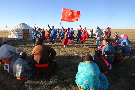 9月20日,内蒙古自治区苏尼特右旗,乌兰牧骑队员来到额仁淖尔苏木查干哈达嘎查,为牧民表演近2小时的节目。作为内蒙古首支“红色文艺轻骑兵”工作队,他们从60多年前开始就在草原上为农牧民开展演出和服务工作。