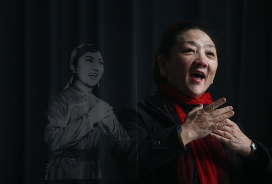 苏尼特右旗乌兰牧骑第九任队长、60岁的斯琴高娃在内蒙古自治区苏尼特右旗文化中心,左边是她年轻时的演出剧照。她在13岁时就加入了这支队伍。(照片为二次曝光)
