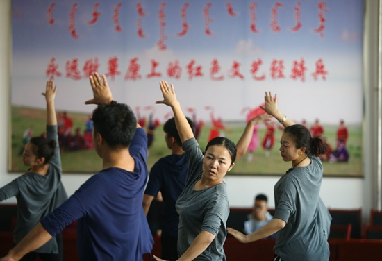 午后的苏尼特文化中心,顺着马头琴声走进排练厅,苏尼特右旗的乌兰牧骑队员正在打扫舞台、调试乐器,身后的白墙上写着红色的蒙汉双语“人民需要艺术 艺术也需要人民”。不多会儿,男女演员们伴随着节拍在舞台上飞舞起来,一曲终了,39岁的队长孟克立即走上舞台,用蒙语严厉地一一点评演员们在排练中的问题。
