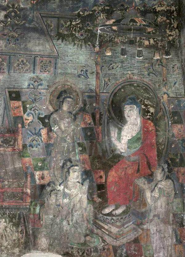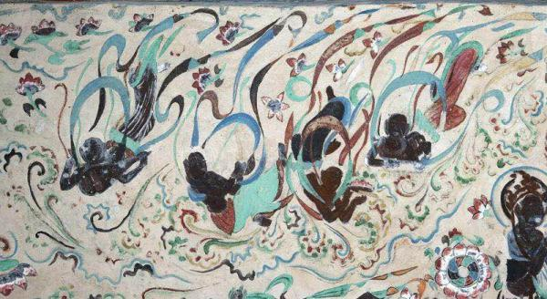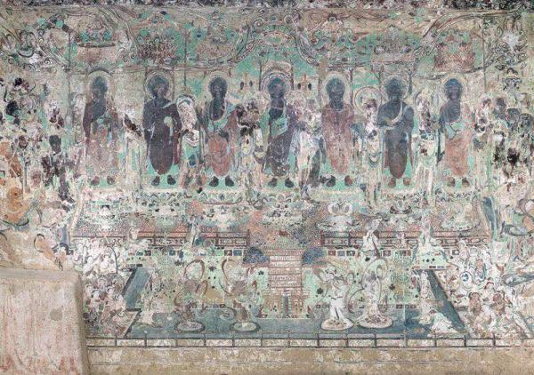 段文杰院长用复原临摹的方法,临摹了很多敦煌壁画。他是临摹壁画面积最多也是艺术水准最高的,至今没人能超过他。甬道的《都督夫人礼佛图》已经看不清了,40年代剥落以后面目全非了,但是段院长因为他研究敦煌服饰、中国服饰,用很严谨的大量理论研究的基础上,把色彩抓准,用画家独特的笔墨复原出来了这幅作品,这幅作品现在保存在敦煌研究院,迄今都没有人能够超过他的艺术水准。我们在日本做展览的时候,这幅画曾经展出过一次,日本方面打来电话,问这幅画能不能留在日本?当时大家就说,这幅画已经成为我们的国宝了,已经很重要了。