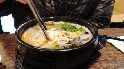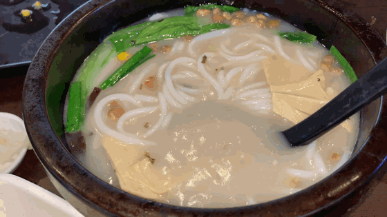 这家米线的吃法可以说是将云南当地吃过桥米线的仪式感献给每一位食客,鸡肉、火腿肉、豆芽、鹌鹑蛋、木耳……光是配菜就有十种之多,荤素搭配,营养均衡。按照先荤后素的原则,将配菜一一倒入滚烫的高汤里,再加入烫熟的米线,米线久煮不烂,煮熟后汤头也不会变得浑浊,吃起来弹滑爽口,且富有韧性。不过小编最期待的汤却有些油腻......
