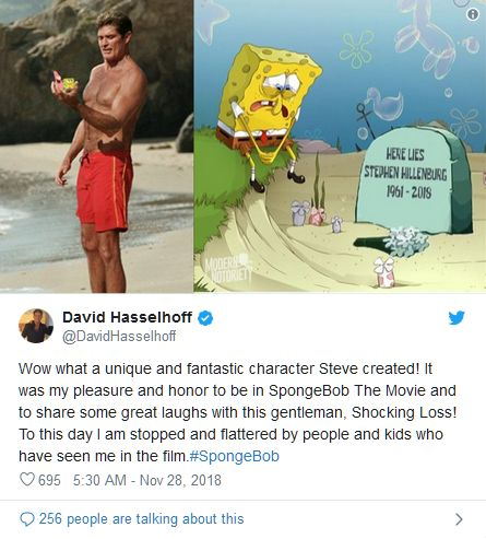 曾参演2004年《海绵宝宝历险记》的演员大卫·哈塞尔霍夫也在Twitter上发文悼念。“哇,史蒂夫创造了一个多么独特和神奇的角色啊!我很高兴也很荣幸能在《海绵宝宝》电影中和这位绅士一起开怀大笑,(史蒂夫的离去)真的是巨大的损失!直到今日,我还会被那些看过电影的人和孩子们叫住。”