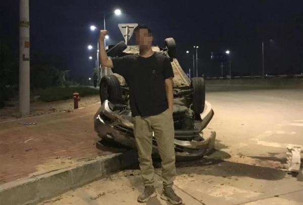 陈某深知闯下大祸,没有报警,而是叫来两个同事帮忙。陈某觉得车翻了,自己竟然没事,特意让同事帮忙拍下这张劫后余生的照片,还凹了个造型。▼