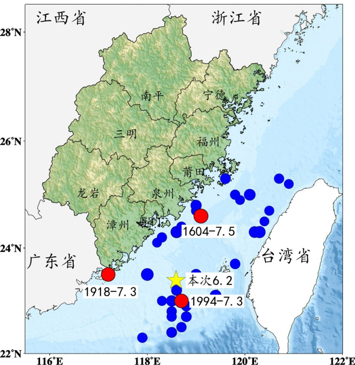 此次6.2级地震所在的台湾海峡位于东南沿海地震带北段,处于台湾造山带前缘,受马尼拉海沟影响,地质构造较为复杂,震区周边历史强震较为活跃。震中周边100千米范围内历史上发生5级地震13次,6级地震1次,7级地震1次,最大地震为1994年9月16日7.3级地震(图1)。此次6.2级地震与1994年7.3级地震一样,都发生在早第三纪前陆盆地的边界断层带,初步判定此次地震发震构造为东山隆起东缘断裂。