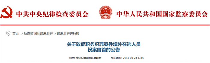 8月23日,国家监委会同最高法、最高检、公安部、外交部等五部门联合发布《关于敦促职务犯罪案件境外在逃人员投案自首的公告》(下称《公告》)。
