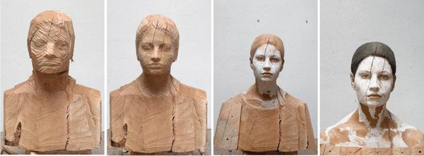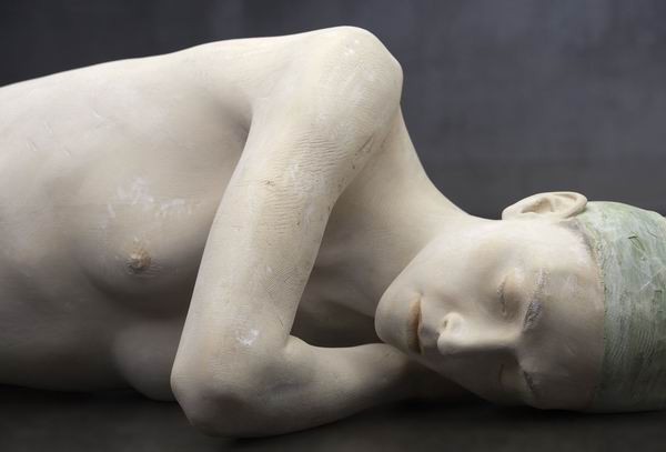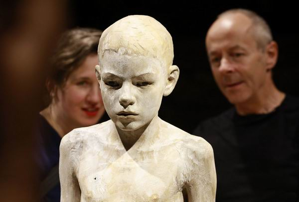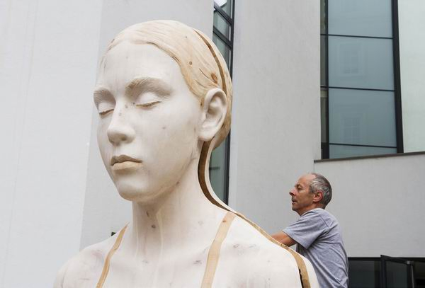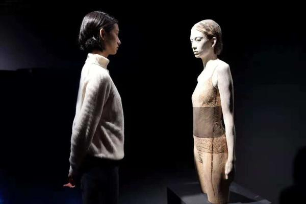 布鲁诺为浙江美术馆展览特别驻地以中国女子项偞婧(左)为模特创作的木雕作品
