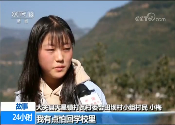 大关县天星镇打瓦村委会田坝村小组村民 小梅:我有点怕回学校里,因为辍学的学生回去之后,老师就会有一种偏见,觉得学生回来之后,肯定只是来混个毕业证,对你就会有一种不一样的看法。他们就劝我,就说老师不会这样,都是平等对待每一个学生的,让我好好回来读书。