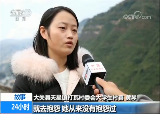 大关县天星镇打瓦村委会大学生村官 黄琴:特别乐观,并不会因为工作上遇到的小困难抱怨,比如说停电,我们村停电的时候工作特别紧,她点着蜡烛写,还说挺浪漫的,会给自己在困难中活跃气氛,并不会去抱怨工作。