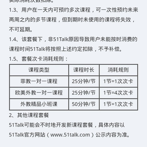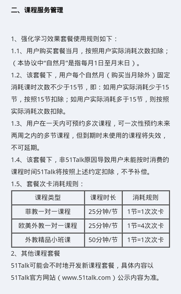 51Talk与用户合约的《强化学习效果套餐服务协议》规定,强化学习效果套餐下,用户每个自然月(购买当月除外)固定消耗课时次数不少于15节,用户实际消耗少于15节,按照15节扣除,用户实际消耗多于15节,按照实际消耗次数扣除。同时,该套餐下,非51Talk原因导致用户未能按时消费的课程时间51Talk将按照上述约定扣除,不予补偿。