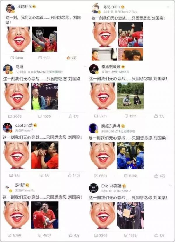 11月1日,在瑞典公开赛督战的中国乒乓球协会副主席刘国梁在听闻马龙伤情时,写道:“这一刻心比腿还疼……”