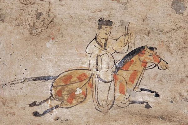 1973年嘉峪关新城魏晋5号壁画墓出土,砖上绘一信使,头戴黑帻,着皂缘领袖中衣,左手持棨传文书,跃马疾驰。棨传为通过关卡、驿站时的信物。驿马四蹄腾空,奔弛在戈壁绿洲的道路上。这块写实砖画,在我国邮政史上具有重大意义。20世纪80年代初,在世界万国邮政波兰大会上,此画曾作为中国邮政标志物。为纪念中华全国集邮联合会第一次代表大会的召开,邮电部于1982年8月25日发行《驿使图》纪念邮票(小型张)一枚。