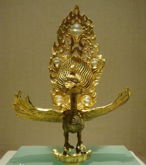 这只金翅鸟通体鎏金,呈昂首展翅欲飞状,头部有美丽的羽冠,尾羽上镶嵌水晶珠,立于莲座上。