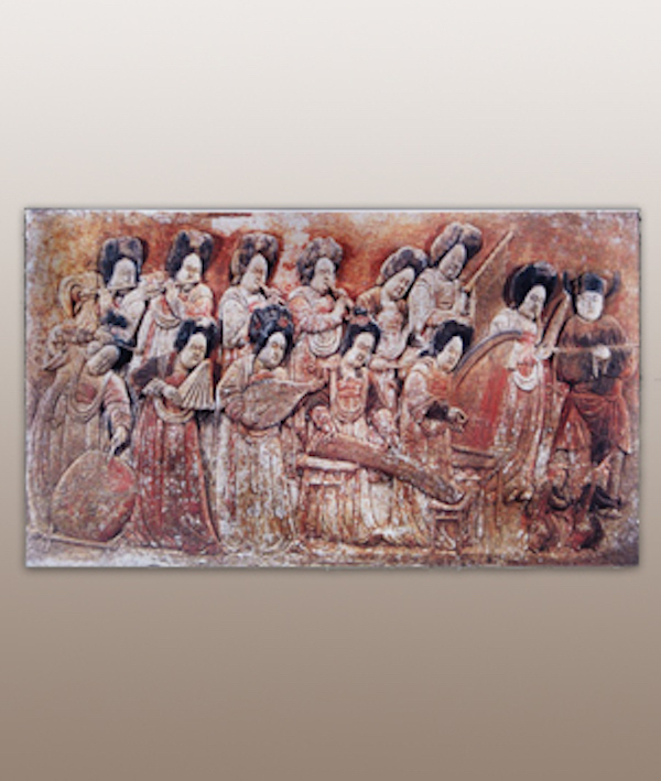 墓葬墙面装饰品。1995年曲阳县西燕川村王处直墓出土,长136、高82厘米。由15人组成,表现了乐队吹奏表演的热闹场面。右边第一人着男装,可能是乐队指挥。12名演奏者皆为女子,身着窄袖襦衫,长裙曳地,分前后两排,所持乐器有箜篌、筝、琵琶、拍板、座鼓、笙、方响、筚篥、横笛等。乐队指挥下方有孝子2人。盛唐风格,国内仅见。