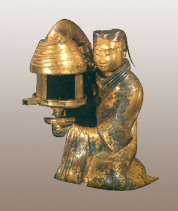 1968年满城县陵山中山靖王刘胜妻窦绾墓出土。高48厘米,形状为跪地执灯的年轻宫女,通体鎏金。灯盘可转动,灯盘的屏板可推动开合,以调节灯光亮度和照射方向。宫女身体中空,烟灰经右臂进入体内,从而保持室内清洁。全灯分为头、身、右臂、灯座、灯盘、灯罩等部分,可以任意拆卸。灯上刻有“长信尚浴”、“阳信家”等铭文9处共65字。